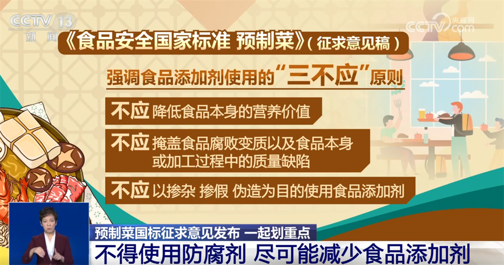 国家食品安全风险评估中心标准二室主任 王君:在此基础上,为引导食品企业通过改进工艺技术保障预制菜产品的安全与营养品质,从技术源头减少对食品添加剂的依赖,标准要求除不得添加防腐剂外,还要尽可能减少食品添加剂的使用,严格控制了允许使用的食品添加剂品种,将可使用的食品添加剂种类缩小至国家标准规定的、可在各类食品中“按生产需要适量使用”的添加剂品种。