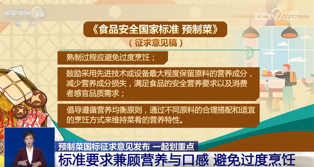 中国商业联合会标准法规部副部长 刘振宇:标准对预制菜产品的原料或成分的投料量,或其在成品中的含量标示给出了详细规定,让消费者可以通过标签一目了然地了解到产品的真实情况,对于帮助消费者选购有关键作用。二是要求标签标注食用方式,以防止未熟制和未完全熟制的产品因加热不充分引发食源性疾病,同时防止对已经熟制过的预制菜过度加热而影响产品营养、品质和口感,本标准规定预制菜标签应明确标示产品的食用方式,预加工已熟制的应标示“需加热或复热后食用”;预加工未熟制及未完全熟制的应标示“需熟制后食用”。