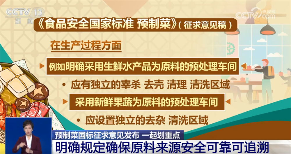 国家食品安全风险评估中心标准二室主任 王君:使用的畜类、禽类、水产品、蛋类、食用菌、淀粉等原料均需分别符合相应食品安全标准,不得使用腐败变质的原料,农药残留、兽药残留、污染物、真菌毒素等均需符合相应限量管理要求,并要索证索票、验收合格,确保原料来源安全可靠、可追溯。