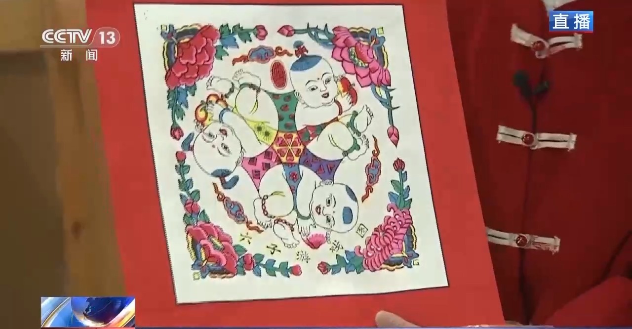 武强年画来自民间,乡土气息浓厚。考考大家,这幅作品上面有几个胖娃娃?答案是六个。创作者巧妙借用三个娃娃的头部和臀部,形成“三头六身”的巧思,既讨喜,又暗含“多子多福、六六大顺”的祝福。再看娃娃手中的物件:苹果代表平安,桃子象征长寿,柿子寓意事事如意,一笔一画都是老一辈人对美好生活的期许。