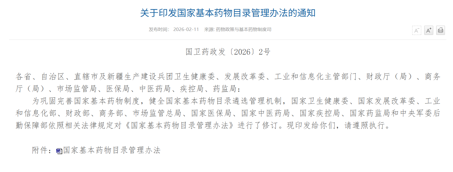 2月11日,国家卫生健康委、国家发展改革委、工业和信息化部、财政部、商务部、市场监管总局、国家医保局等11部门联合印发《国家基本药物目录管理办法》(简称《办法》),自发布之日起施行。原国家卫生计生委2015年2月13日印发的《国家基本药物目录管理办法》同时废止。
