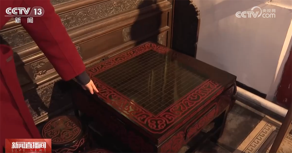 在燕京八绝博物馆的小展厅里,这里搭建了一个生活化的场景,屏风所使用的是京绣工艺,围棋桌用的是雕漆工艺。