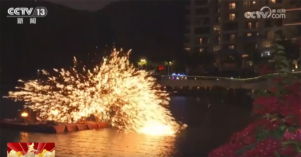 在三亚亚龙湾,一场穿越古今的新春游园会正在上演。百米灯廊下,游客们穿行在古风市集里,湖中央表演了打铁花,滚烫的铁水化作流星雨散落夜空。