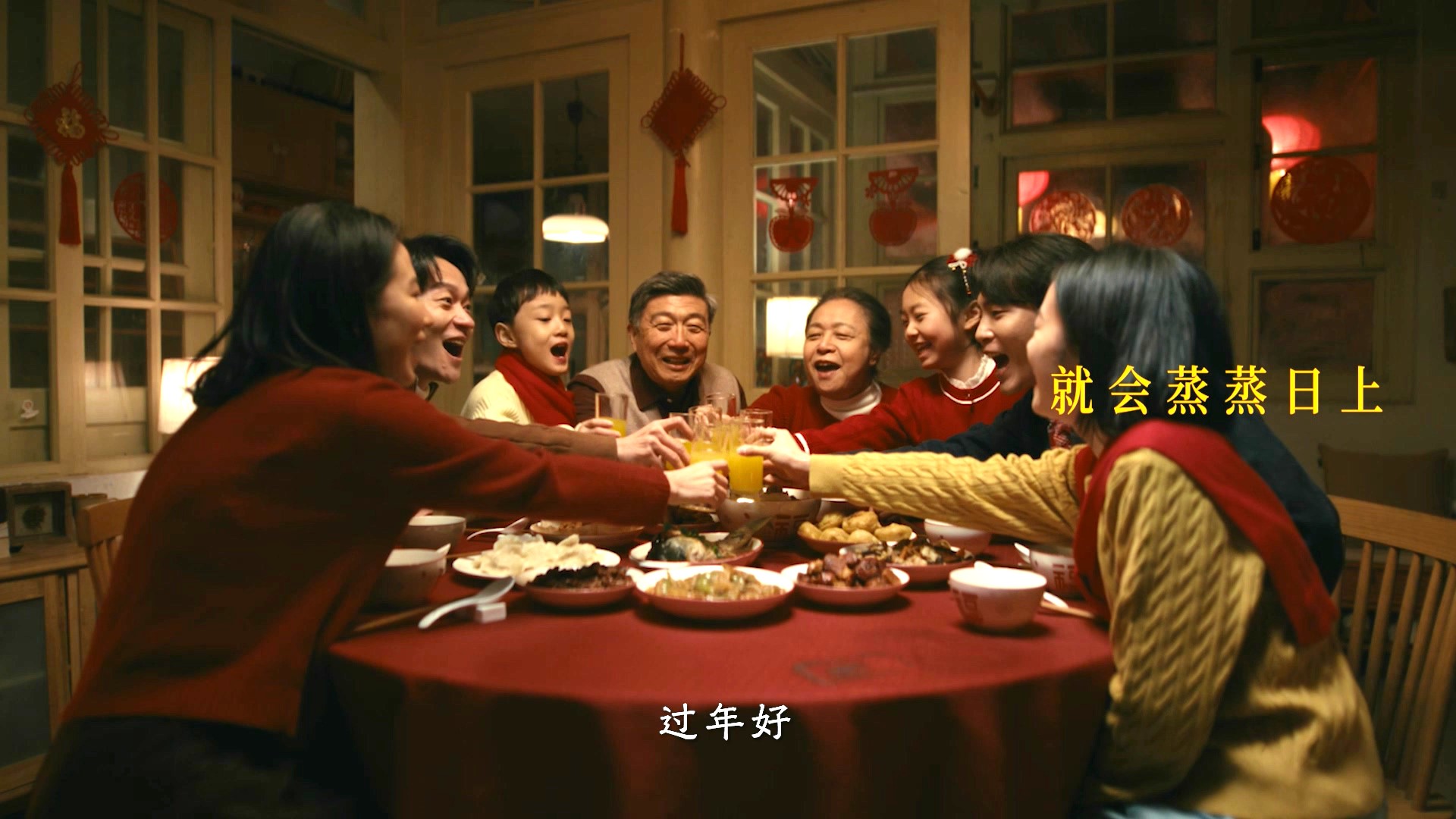 春节阖家团圆之时,家人间的温情更显浓烈。影片的主题在团聚的镜头中自然升华。镜头里,孩子为爸妈精心准备的可口饭菜;一家人身影挨得很近,心贴得更紧;大家围坐在桌前欢声笑语。这便是我们的家——柴米油盐,三餐四季,热气腾腾,蒸蒸日上。小家的日常烟火,映照出当下人们的幸福模样,承载对美好生活的向往,寄托了对崭新未来的无限期许。
