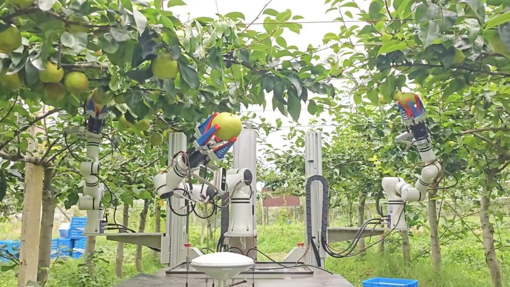 在江苏丹阳的梨园,一款横排三臂的采摘机器人穿梭于水平棚架间,它模仿果农“轻托斜拽”的手法,让梨子的果柄自然断裂。农业农村部南京农业机械化研究所梨多臂采收机器人技术负责人余山山向记者介绍,这款机器人每小时可采摘300斤梨子,由于模拟了果农的采摘方法,不伤茎,检测损伤率约为2.5%。