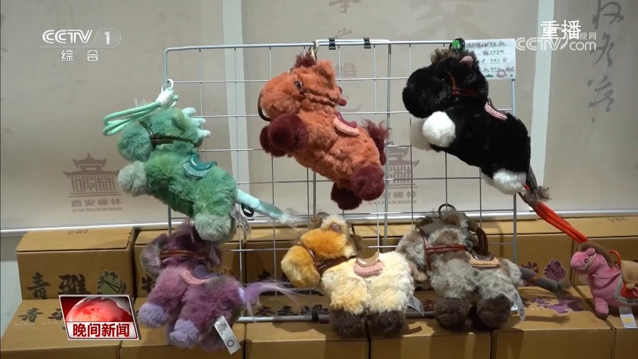 在西安碑林博物馆,以唐代“昭陵六骏”石刻为原型的毛绒玩具集历史文化和现代设计于一体,线下门店经常卖断货。