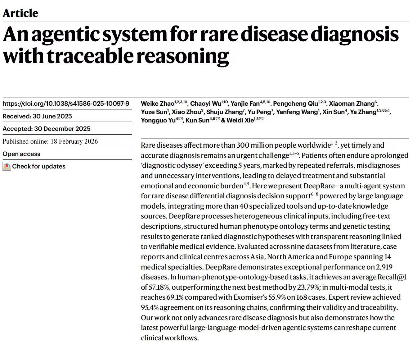 2月19日凌晨,上海交通大学医学院附属新华医院孙锟教授、余永国教授领衔团队与上海交通大学张娅教授、谢伟迪副教授领衔团队联合研发出一款能看罕见病的人工智能系统,相关成果北京时间2月19日在国际顶尖期刊《自然》上发表。这套名为DeepRare的系统,被称作全球首个“推理过程可追溯”的罕见病智能医生。