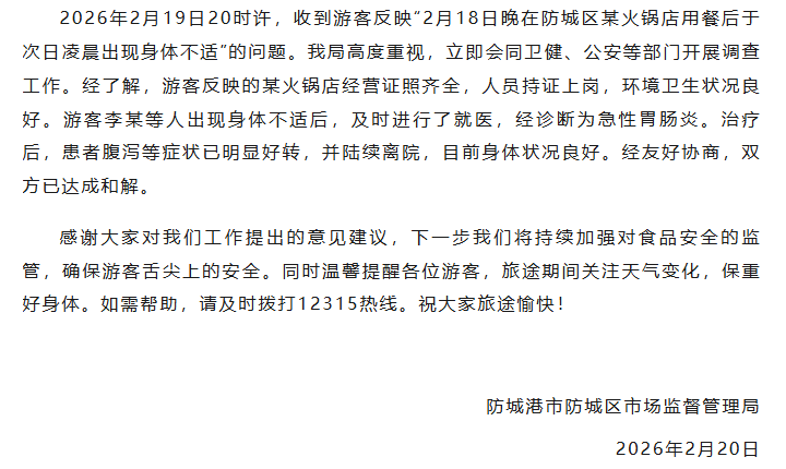 ·多人在广西防城港一火锅店用餐后上吐下泻,当地通报:系急性胃肠炎,火锅店经营证照齐全,人员持证上岗,环境卫生状况良好。