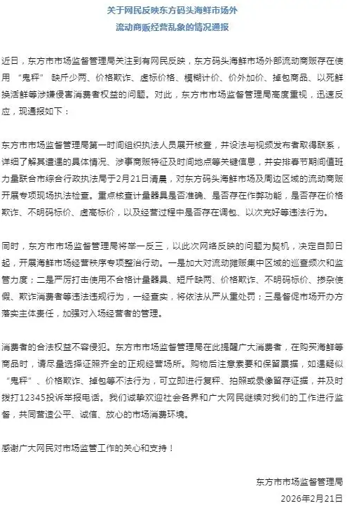 ·海南一海鲜市场外部流动商贩被指用 “鬼秤” 等,官方通报:已开展专项现场执法检查。