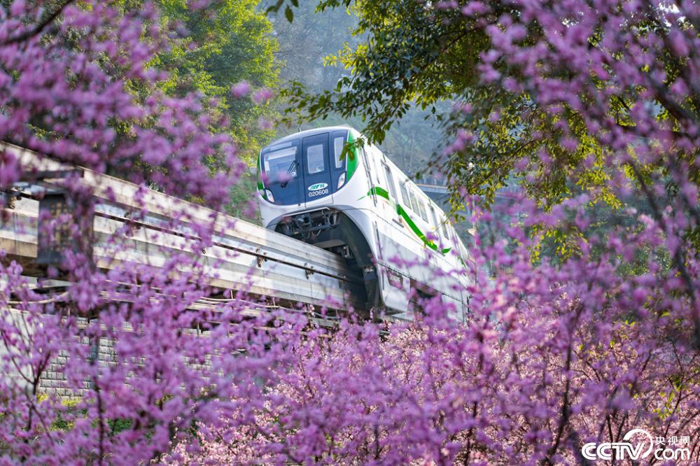重庆轨道交通2号线佛图关段的美人梅迎春绽放,列车穿行花海,宛如开往春天的列车。