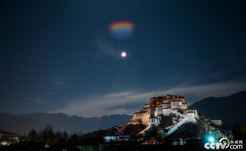拉萨布达拉宫夜空,摄影师拍摄繁星与月亮缓缓落山。镜头中,不断下落的月亮在玻璃上投射清晰细节,不断强化的光晕似七彩降落伞一般,在布达拉宫上方形成七彩祥云般的景象。