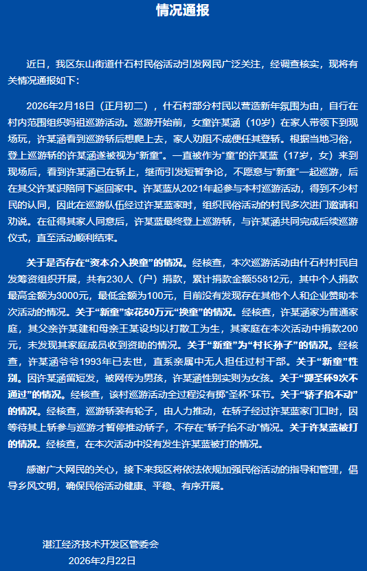 ·湛江市东山街道什石村妈祖巡游活动存在“资本介入换童”?官方通报:所谓“新童”家花50万元“换童”,不实。