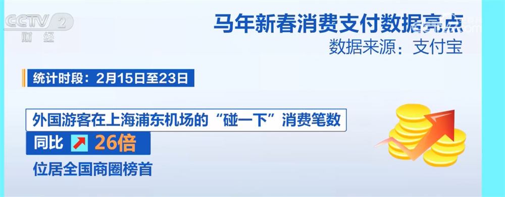 随着免签“朋友圈”扩容,在便利入境政策与浓厚中国年味吸引下,春节期间外国游客在华消费支付数据增长明显:支付宝数据显示,全球游客用 “外卡内绑”和“外包内用”两类便利支付服务在华的消费,同比去年春节交易笔数增长近90%。其中,入境游客用支付宝消费金额同比去年春节增长超80%。外国游客在上海浦东机场的“碰一下”消费笔数同比增长26倍,位居全国商圈榜首。