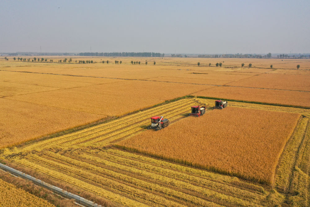 在吉林省公主岭市,吉林省米兜种植农民专业合作社进行机械化收割水稻作业展示(2025年10月14日摄,无人机照片)。 新华社记者 张楠 摄