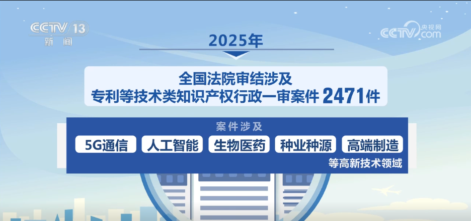 2025年,全国法院审结涉及技术类知识产权民事一审案件63971件。全国法院审结涉及专利等技术类知识产权行政一审案件2471件。案件涉及5G通信、人工智能、生物医药、种业种源、高端制造等高新技术领域。2025年,全国法院审理知识产权案件适用惩罚性赔偿505件,判赔金额18亿元,有效遏制和打击了严重侵犯知识产权行为。