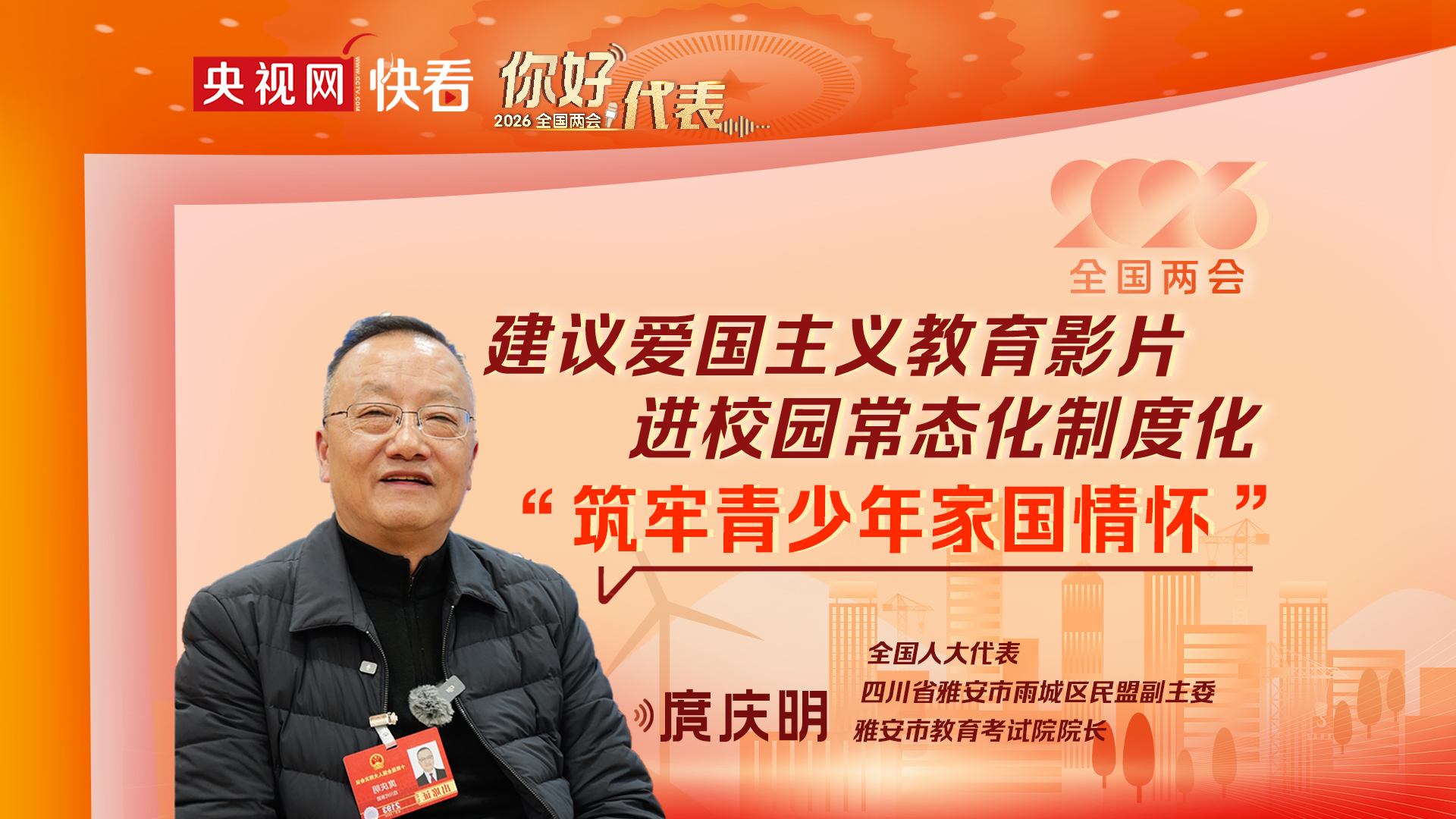 央视网消息(记者/阚纯裕 制作/姚抒廷 卢洋):怀揣着沉甸甸的建议与百姓的期盼,连续九年履职的全国人大代表、四川雅安市教育考试院院长庹庆明,再次忙碌在两会代表驻地。今年,他将目光聚焦于青少年的精神成长,带来一份关于推动爱国主义教育影片进校园常态化、制度化的建议,旨在筑牢孩子们的家国情怀。
