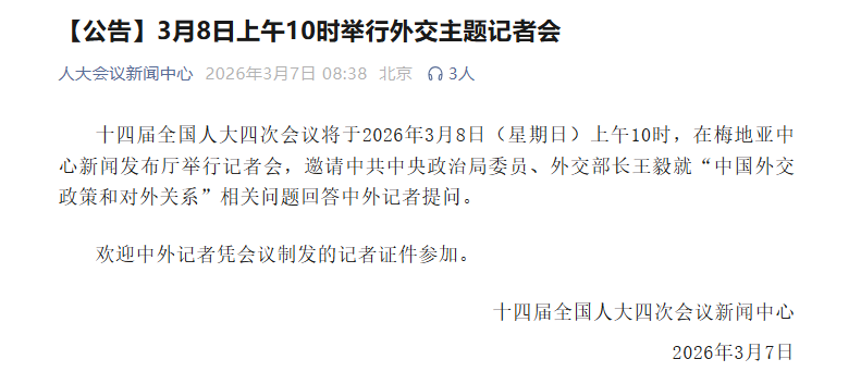 央视网消息:十四届全国人大四次会议将于2026年3月8日(星期日)上午10时,在梅地亚中心新闻发布厅举行记者会,邀请中共中央政治局委员、外交部长王毅就“中国外交政策和对外关系”相关问题回答中外记者提问。