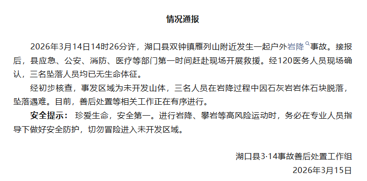 3月14日14时26分许,江西九江湖口县双钟镇雁列山附近发生一起户外岩降事故。接报后,湖口县应急、公安、消防、医疗等部门赶赴现场开展救援。经120医务人员现场确认,三名坠落人员均已无生命体征。