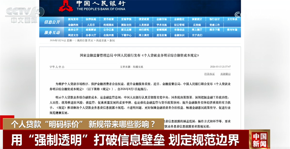 3月15日,国家金融监督管理总局、中国人民银行公告《个人贷款业务明示综合融资成本规定》正式发布,2026年8月1日起施行,届时按照“新老划断”原则,新增业务严格按《规定》要求开展明示综合融资成本工作。