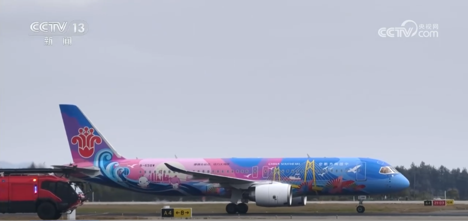 16日上午,南航国产大飞机C919“大美湾区号”彩绘机从广州白云国际机场起飞,飞往温州。一个多小时后,飞机降落在温州龙湾国际机场,这标志着国产大飞机C919在这条新航线上的常态化运营正式拉开序幕,接下来,计划每天执飞广州至温州两个往返航班。