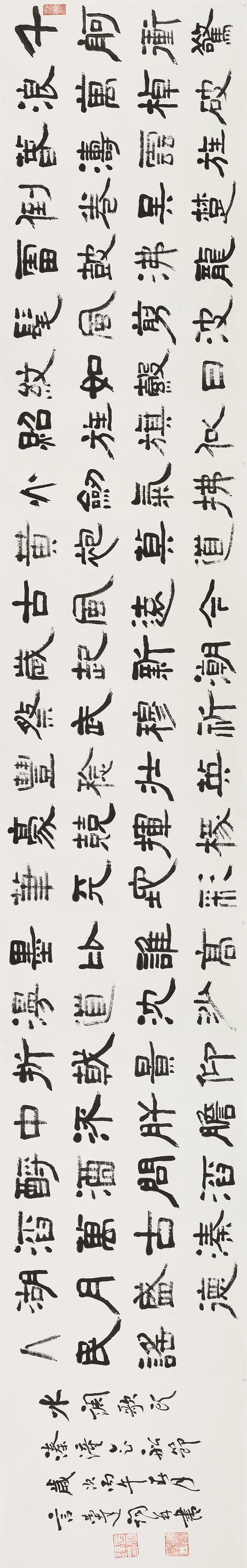 言恭达现场分享了创作感悟时表示,很难有一种场景、一种力量,能让他在自己的艺术创作当中产生如此强烈的触动。溱潼会船节是世界闻名的隆重节日,也是中华民族千年以来生活方式传承当中中国精神的一种当代体现。这一扎根姜堰的民俗盛会,更应展现当地人民千百年来形成的淳朴高尚品格与改天换地的壮志豪情。因此选用汉隶创作95个字的水调歌头作品,更能凸显民俗风情与民间韵味,这种书体承载着姜堰人民千年传承的文化印记,更是中华儿女的精神基因,能与会船精神相融,注入时代血脉。