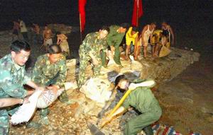 8月23日凌晨,已连续奋战了30多个小时的武警某部战士依然坚守在资江大堤上。湖南省2002年平均降雨比往年同期均值增长三成,全省江河水位全部超过警戒水位。 (新华社记者李刚摄)
