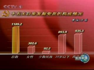 央视国际消息(新闻联播)伟大的中国共产党已经走过了81年光辉的历程,党员队伍不断发展壮大,充满了生机与活力。记者新近从中共中央组织部了解到,截至2002年6月,全国党员总数已达6635.5万名,比1997年增加593.8万名。其中,35岁以下的青年党员1480万名,占党员总数的22.3%;女党员1159.8万名,占党员总数的17.5%;少数民族党员414.6万名,占党员总数的6.2%。
