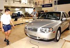 图为来自瑞典的世界著名轿车制造厂商VOLVO公司的工作人员3日在北京国际展览中心展厅里调放展车。(袁满 摄)