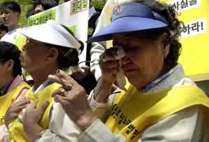 4月18日,200余名韩国民众聚集在汉城的日本大使馆外,抗议日本政府批准由右翼团体编写的歪曲史实、美化侵略的历史教科书。这是曾在第二次世界大战期间被强征为“慰安妇”的韩国妇女李永奈(右)在抗议队伍中擦拭泪水。(新华社传真照片,美联,2001年4月18日)