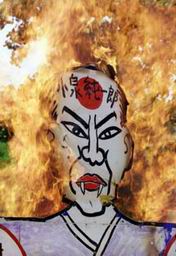 2001年5月10日,一群韩国群众在首都汉城举行集会强烈抗议日本歪曲史实美化侵略的新教科书,在集会上愤怒的群众焚烧的日本首相小泉纯一郎的模拟像。图为被焚的小泉像。(舰船知识网络版)