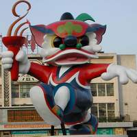 九运会吉祥物是一只名叫“威威”的南狮。南狮是广东地区特有的狮子形象,又叫“醒狮”,以南海最为出名。它的特点是头小身圆,柔和秀美,顶生独角,不失威武雄壮,额有吉祥纹,脸饰彩绒球。为了使南狮的传统形象适应吉祥物的要求,有关专家花了不少心血。吉祥物要求卡通化,还要易于制作成立体形象。为此,得做极度的提炼和夸张,再综合建筑装饰石狮的秀美和民间玩具狮子的童真。它的轮廓被简略,佩饰被淡化,额部放置一如意纹,身上绘有锯齿文饰,再穿上运动服,摆个帅姿势——手持火炬,大步向前。可爱的“威威”形象就这样诞生了。 |