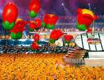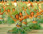 开幕式后有一台名为《盛世中华》的大型文体表演,参与人员达一万三千人,其中充满了南粤特色,以南海醒狮队的舞狮最具气魄。文体表演更多的是表现改革开放以来广东及全国的巨大变化,突出新时代的中国。由音乐喷泉和灯光组成的水幕电影做成的背景别具一格。昨天下午,各路演员还最后彩排了一次,以确保开幕式万无一失。 |