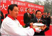 虽然奥体中心远离市区,但为了开幕式,组织者提供了方便的交通服务,体育场的固定停车位就达6500多个,足够多的公交车免费接送观众,在体育场不远处还专设一个火车站,6条轻轨铁路将观众送到市内。所以,观众完全不用担心演出结束后难以回家。 |