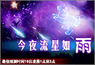 西方极乐世界中,有一对孪生兄弟Santa Claus和Tempel-Tuttle,两人本同为赐福使者,那Santa Claus 因性格和蔼,老成持重,被封为圣诞老人,专于每年12月到人间,将无数礼物送与万众苍生;而Tempel-Tuttle却性格急躁,不慎得罪了上帝,被罚不停地绕着圈跑,每隔33年方得回地球一次,却又总是碰上黄道十二座中的大狮子,因此只得倾其囊中所有,慌乱抛向人间,又带着一路烟尘匆匆而去…… 这就是狮子座流星雨的传说。 北京天文专家揭开流星雨身世之谜 |