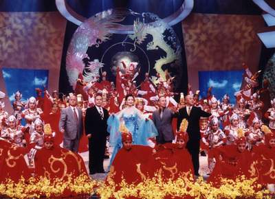 中央电视台2002年春节联欢晚会,在整体的结构上,将采取由中央电视台一号演播厅主会场与深圳“世界之窗环球舞台”分会场对传,以及上海、沈阳和西安三地单边注入现场直播的设计方案。这一总体上的开放式结构,其真正的意义在于如下几个方面: |