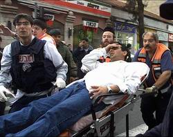 在耶路撒冷最繁华的中心地带,已经发生了不知多少起自杀性恐怖袭击事件。3月21日,就在美国特使津尼说调停已经取得积极成果的当天,又发生了一起“人体炸弹”袭击事件,三人丧生,六十多人受伤。在耶路撒冷,每天都有很多人来到老城著名的哭墙下祈祷,手抚墙壁失声痛哭。