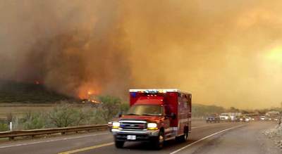 一辆救护车在美国科罗拉多州西格伦伍德驶过当地居民撤离的车队,离公路不远处就是正在燃烧的森林大火。这场火灾的面积已超过11,000英亩,目前火势仍未得到控制。