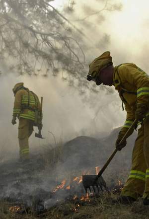 6月14日,消防队员在美国科罗拉多州德克斯附近进行扑灭森林大火的行动。这场森林大火已烧毁10万多英亩森林,火势目前仍未得到控制。