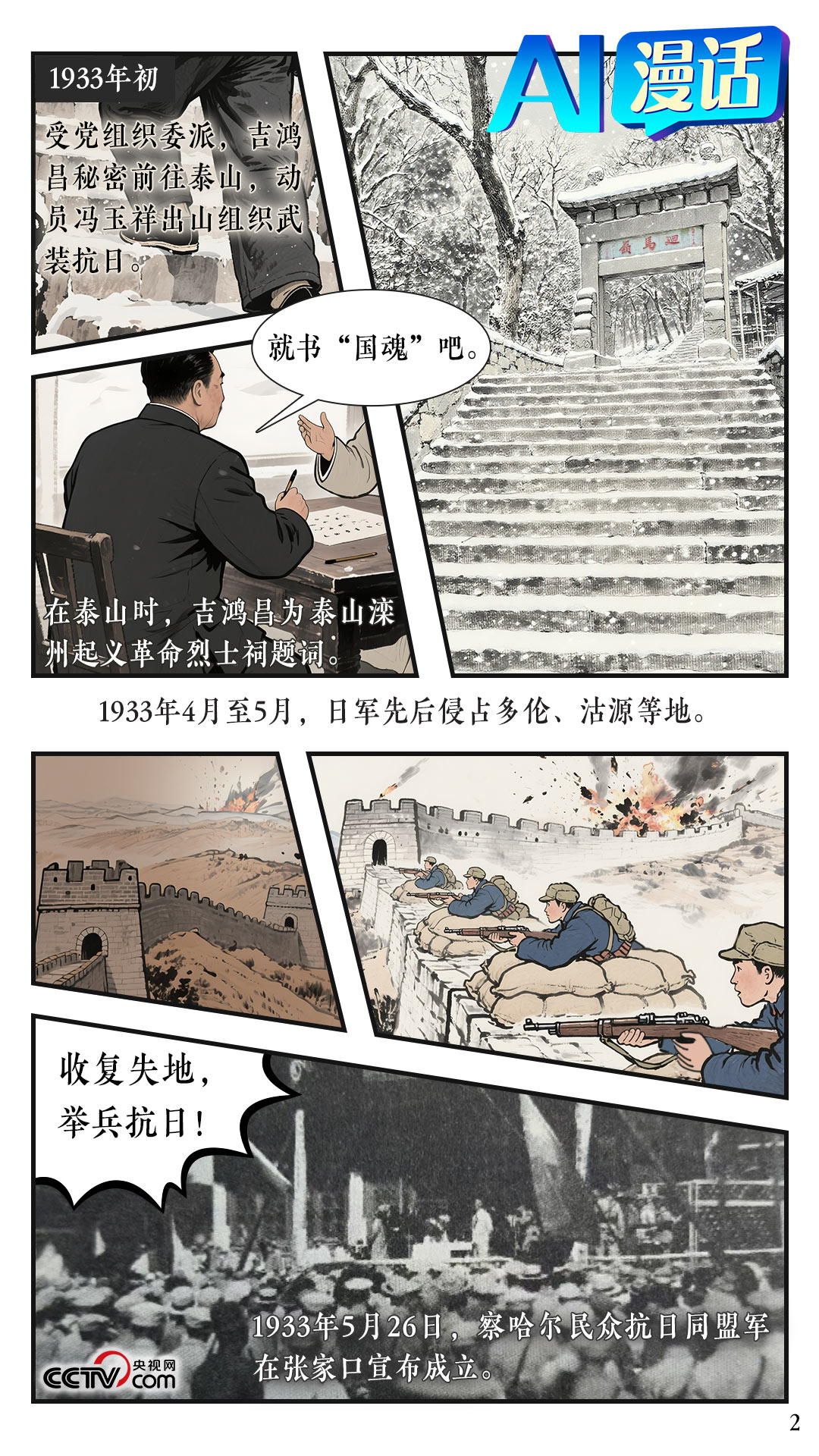 20世纪30年代,面对日寇侵略,在此民族危难之际,吉鸿昌毅然脱离旧军人阵营,选择加入中国共产党。他与冯玉祥等人组织领导了察哈尔民众抗日同盟军抗击日寇,相继收复康保、宝昌、沽源、多伦等重镇,完成九一八事变以来中国军队首次从日本侵略者手中夺回失地的壮举。在天津从事地下活动时,他组织成立了“中国人民反法西斯大同盟”,并秘密印刷《民族战旗》报宣传抗日。
