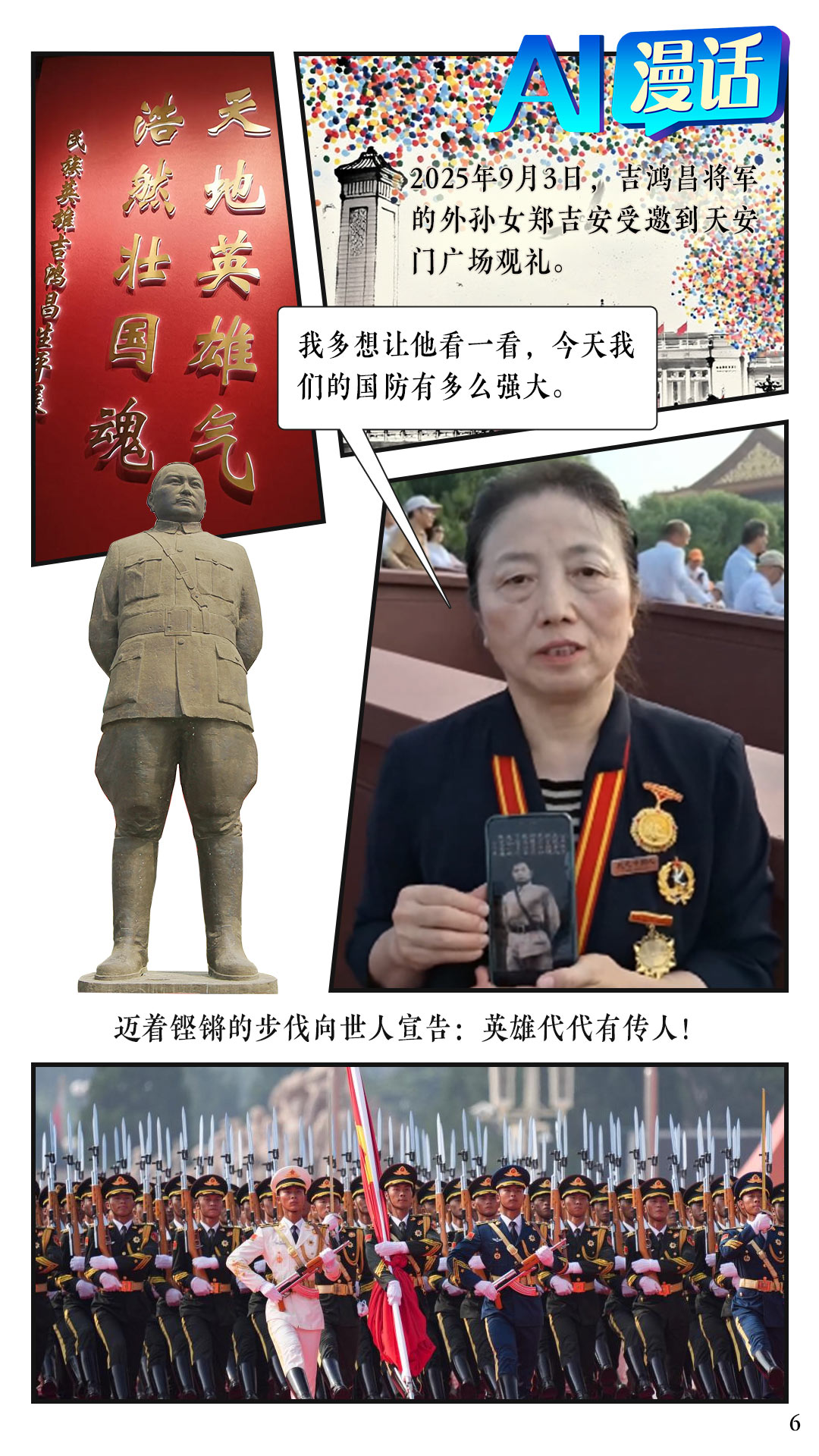 AI漫话2025年9月3日,抗日英雄、爱国将领吉鸿昌的外孙女郑吉安受邀参加阅兵观礼。她特意带上外祖父吉鸿昌的照片,和“他”一同见证山河无恙,盛世如愿。