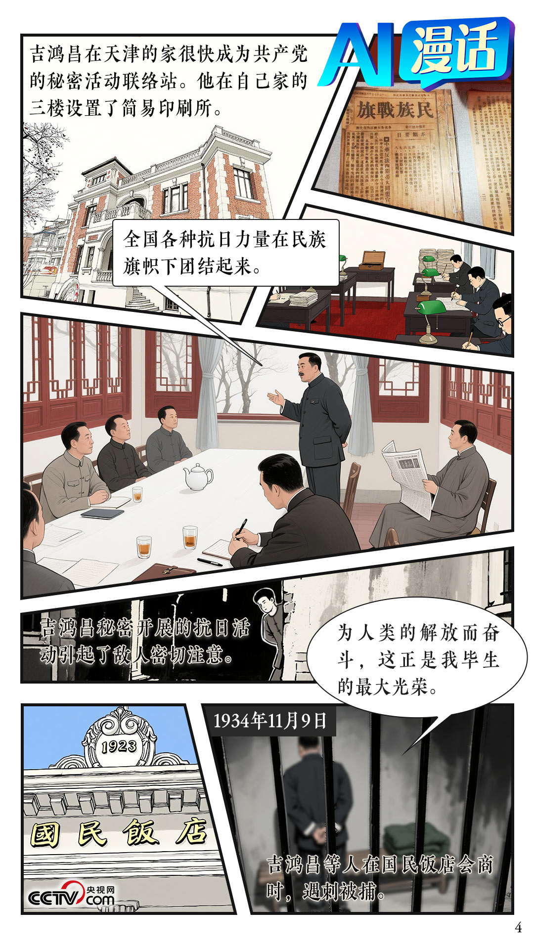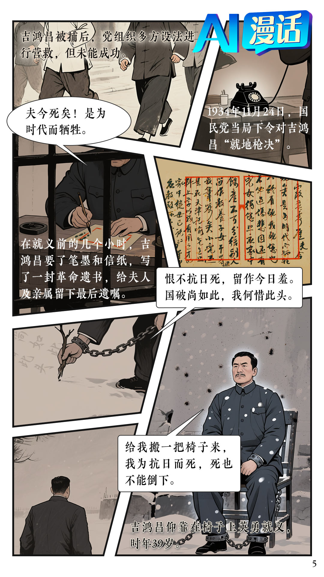 1934年11月9日,吉鸿昌在天津遭军统特务暗杀受伤,随后被捕。面对敌人迫害逼供,他庄严宣示:我是中国共产党党员,为全人类的解放事业而奋斗,已是我毕生最大光荣。同年11月24日,吉鸿昌在北平陆军监狱被杀害。临刑前,他以树枝作笔,以大地为纸,写下了正气浩然的就义诗:“恨不抗日死,留作今日羞。国破尚如此,我何惜此头。”
